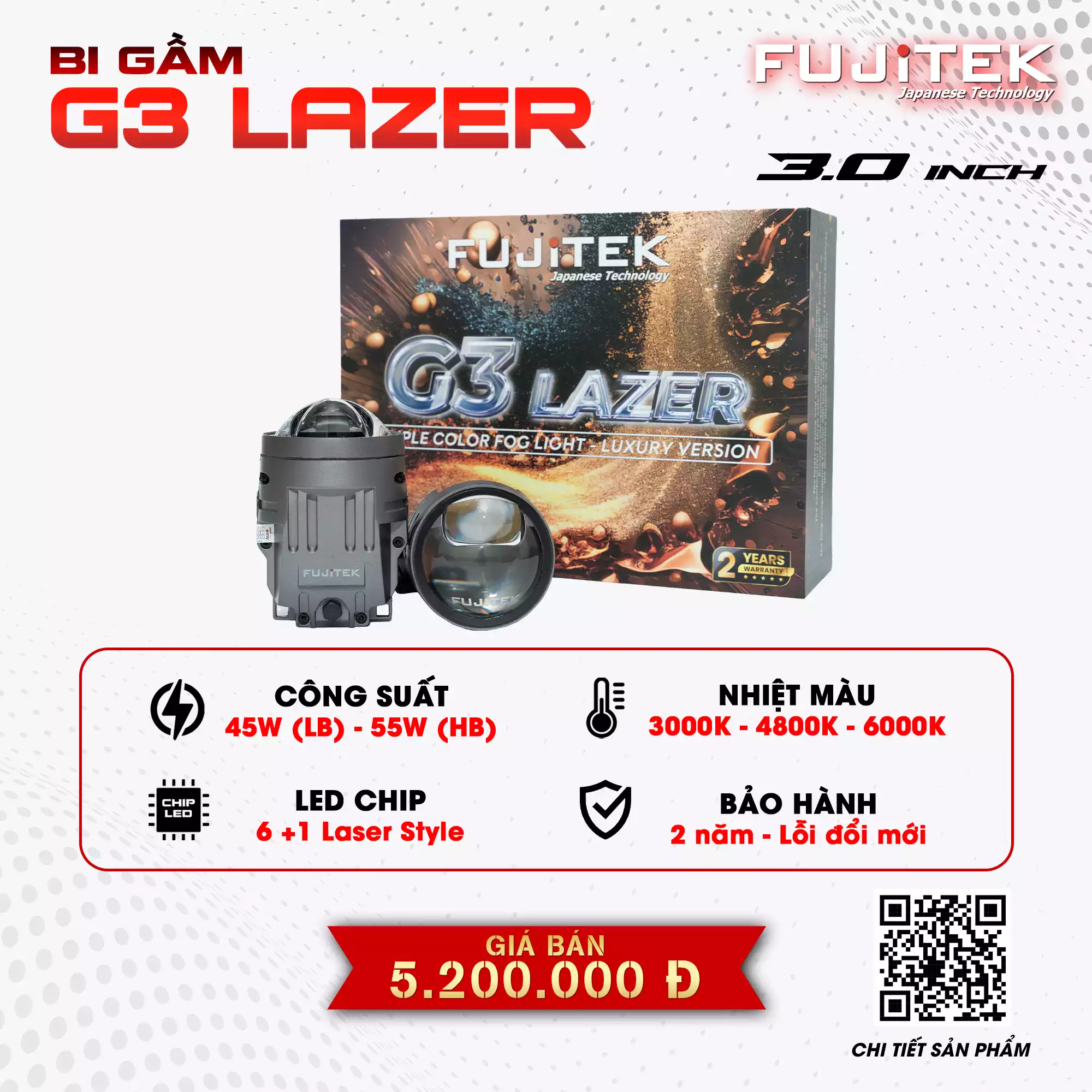Sản phẩm Fujitek G3 Lazer Bi gầm 3″ 3 màu tích hợp là một giải pháp nâng cấp ánh sáng gầm ô tô cao cấp, được thiết kế để mang lại hiệu suất chiếu sáng mạnh mẽ, linh hoạt về màu sắc và tương thích với nhiều dòng xe có hốc bi gầm 3 inch.